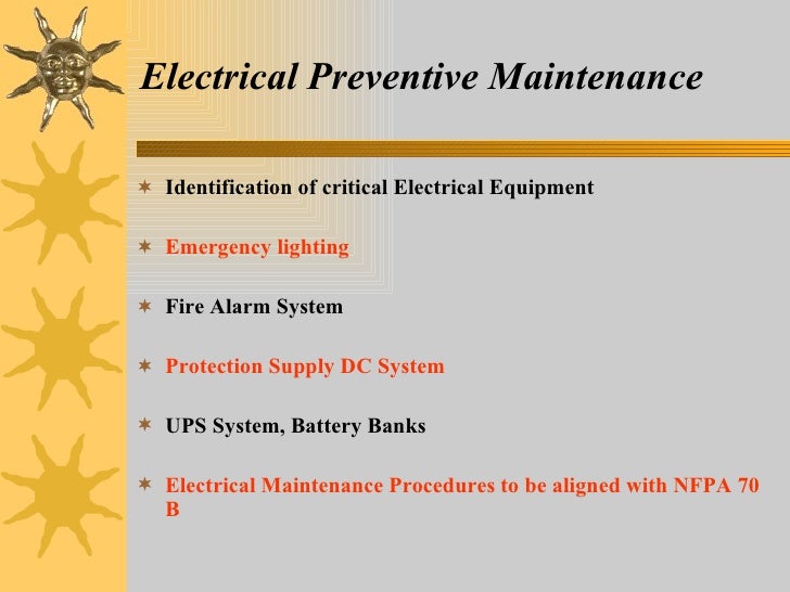 Electrical preventative maintenance checklist the following maintenance checks are crucial to most businesses with electrical machinery large amounts of lighting and other appliances overhead doors and other expensive assets.